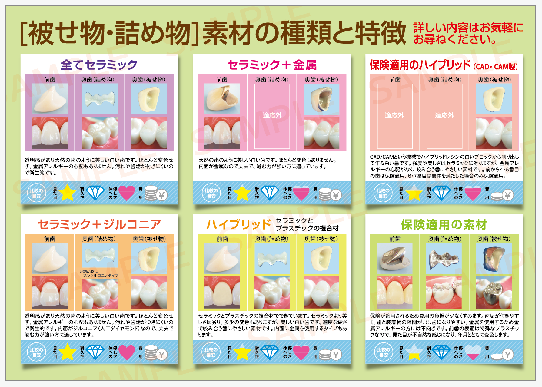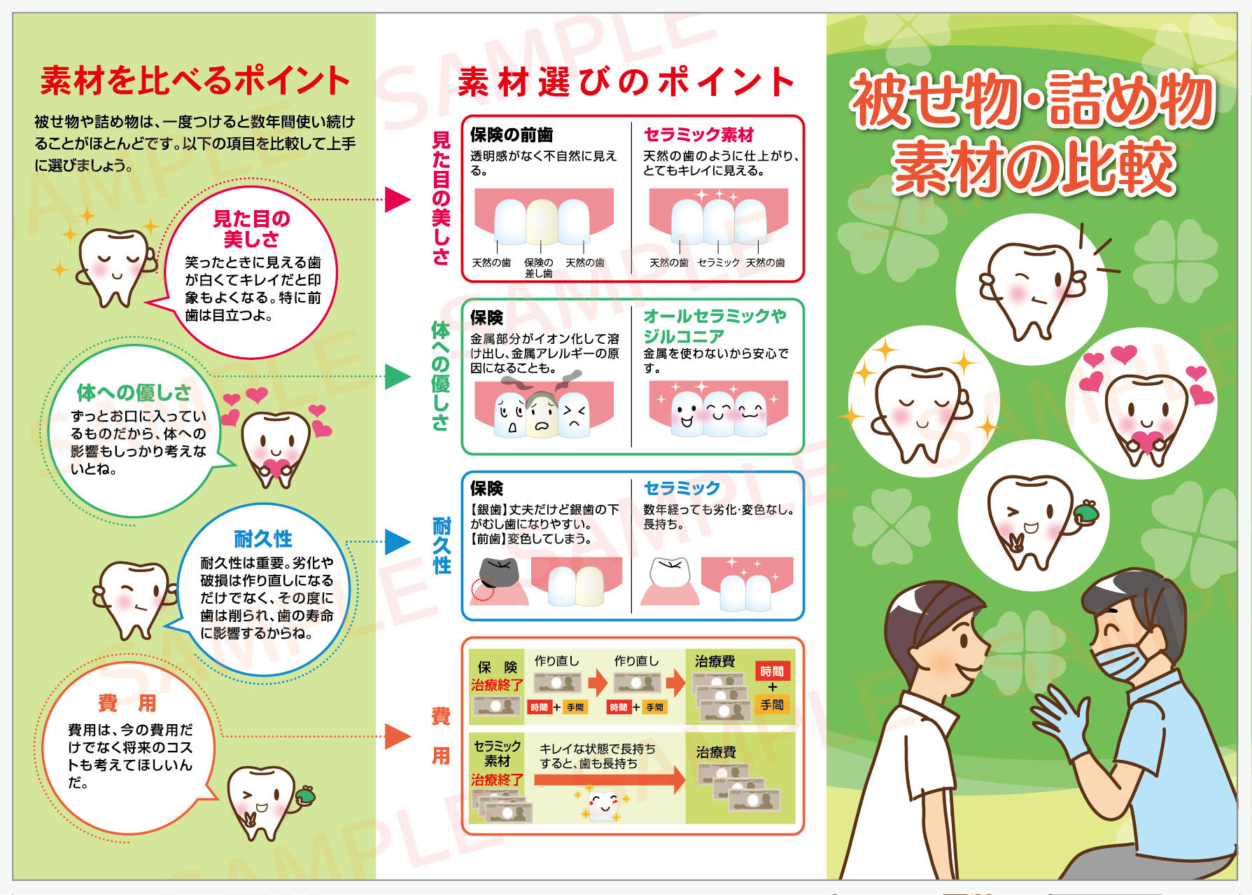 補綴物の種類や特徴の比較説明用リーフレット